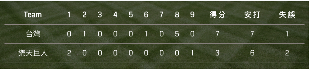 比賽一開始,樂天巨人就靠孫晧塋的兩分全壘打先馳得點,以2比0領先。不過中華隊在1局下馬上反擊,雖然只靠李宗賢的高飛犧牲打追回1分,但展現出不放棄的精神。